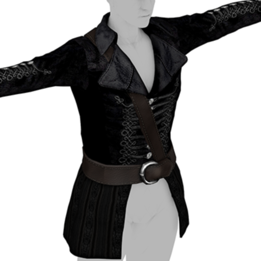 A stylish Pirate coas featuring wide lapels, embroidered details, and leather belt. Designed to be worn with Vanguard Pants, and Frilly Shirt by BlakOpal Designs.