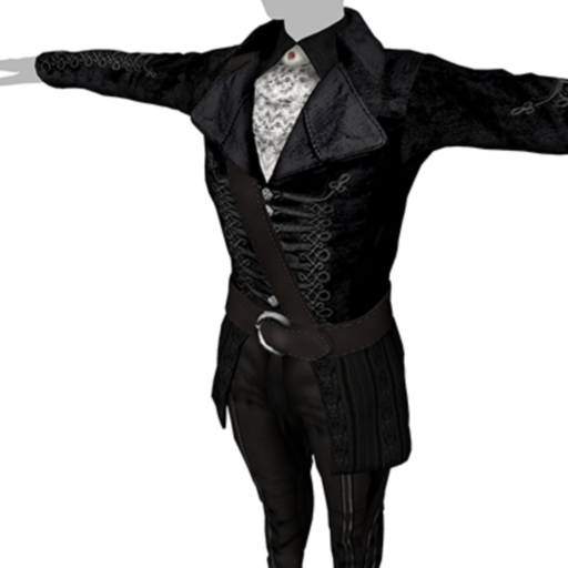 A stylish Pirate outfit that includes jacket, shirt, pants and black crew socks. The coat featuring wide lapels, embroidered details, and leather belt. Swarthy pants feature striped detail and double-button front. Fabulous victorian styled shirt with lace cravate.