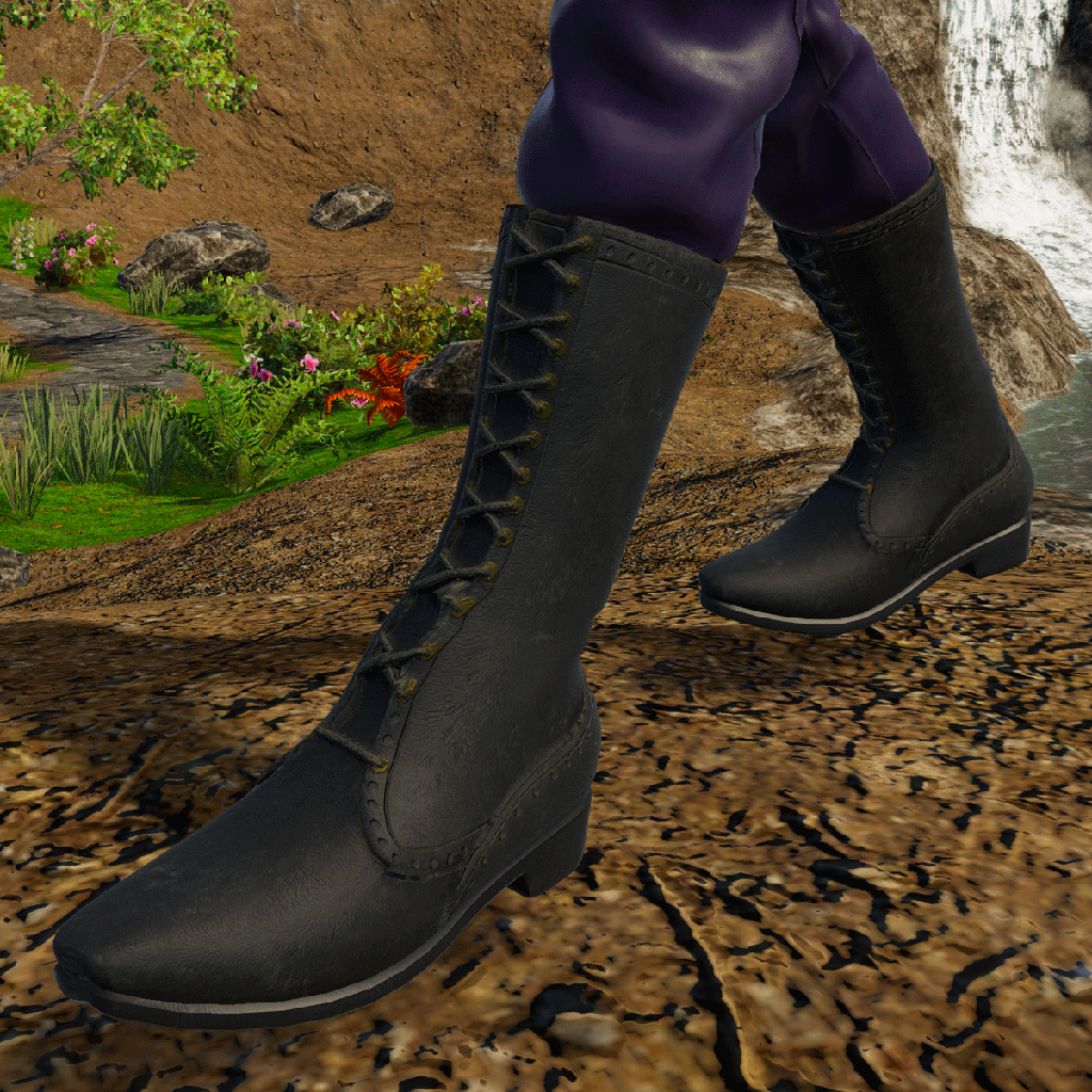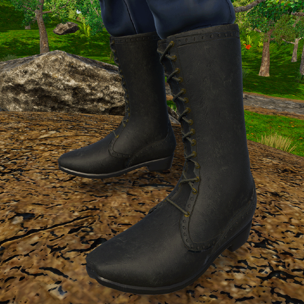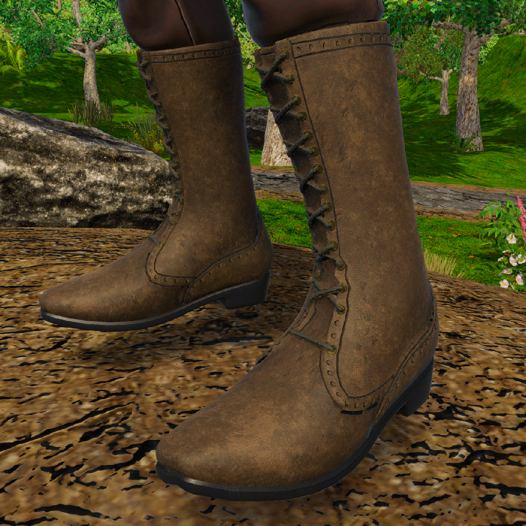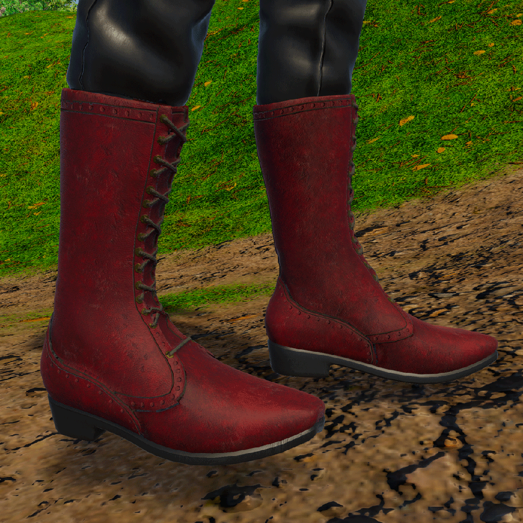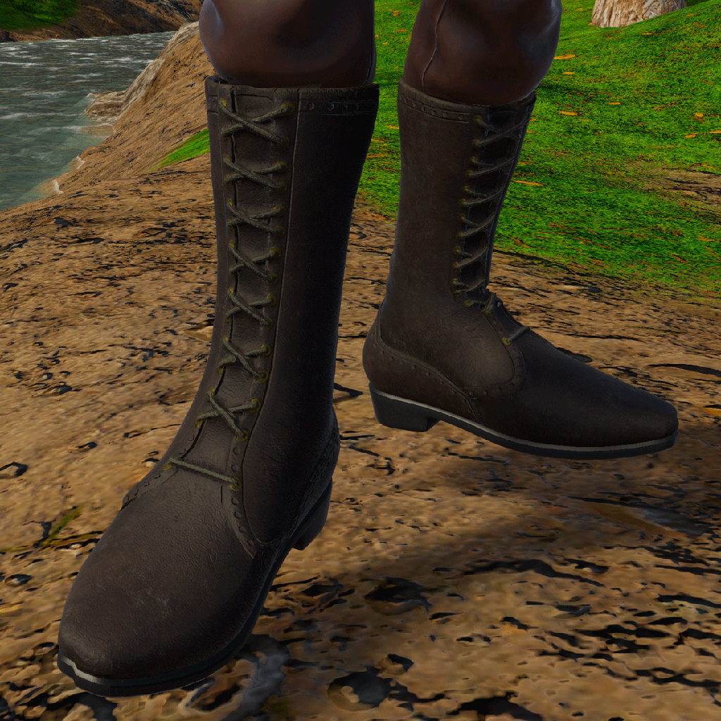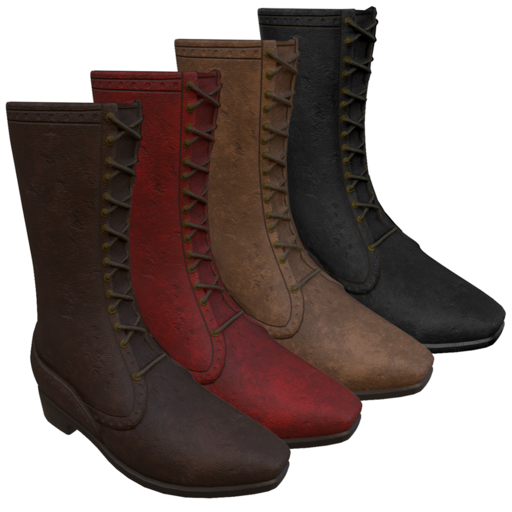 Sturdy laced boots, a bit worn from battle, but ready for your next adventure. Features a squared toe, low heels, and tooled detailing. Designed to look great with the BlakOpal Antilles Pirate outfit. Features high quality model and advanced materials. Bundle includes boots in 4 colors for male avatars.