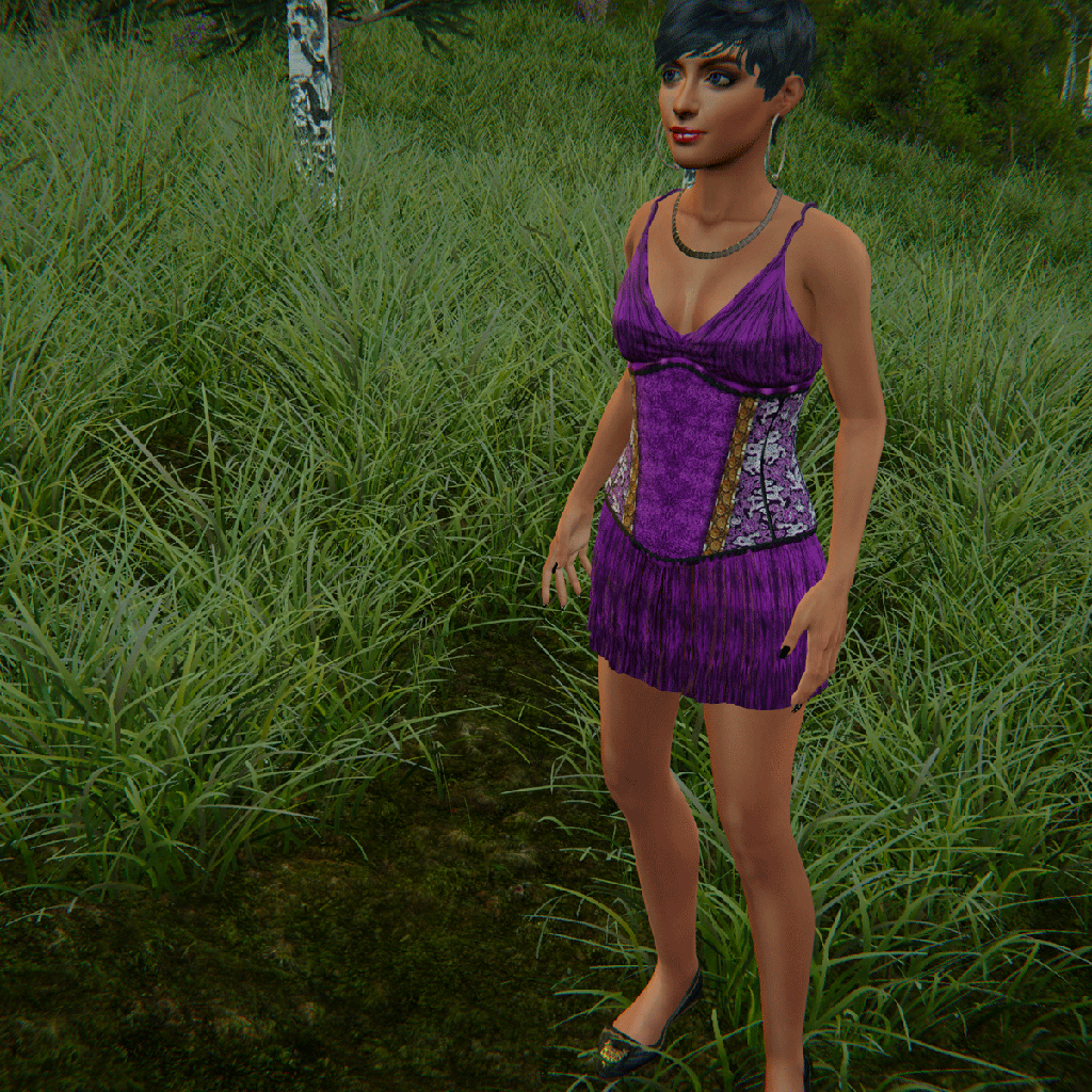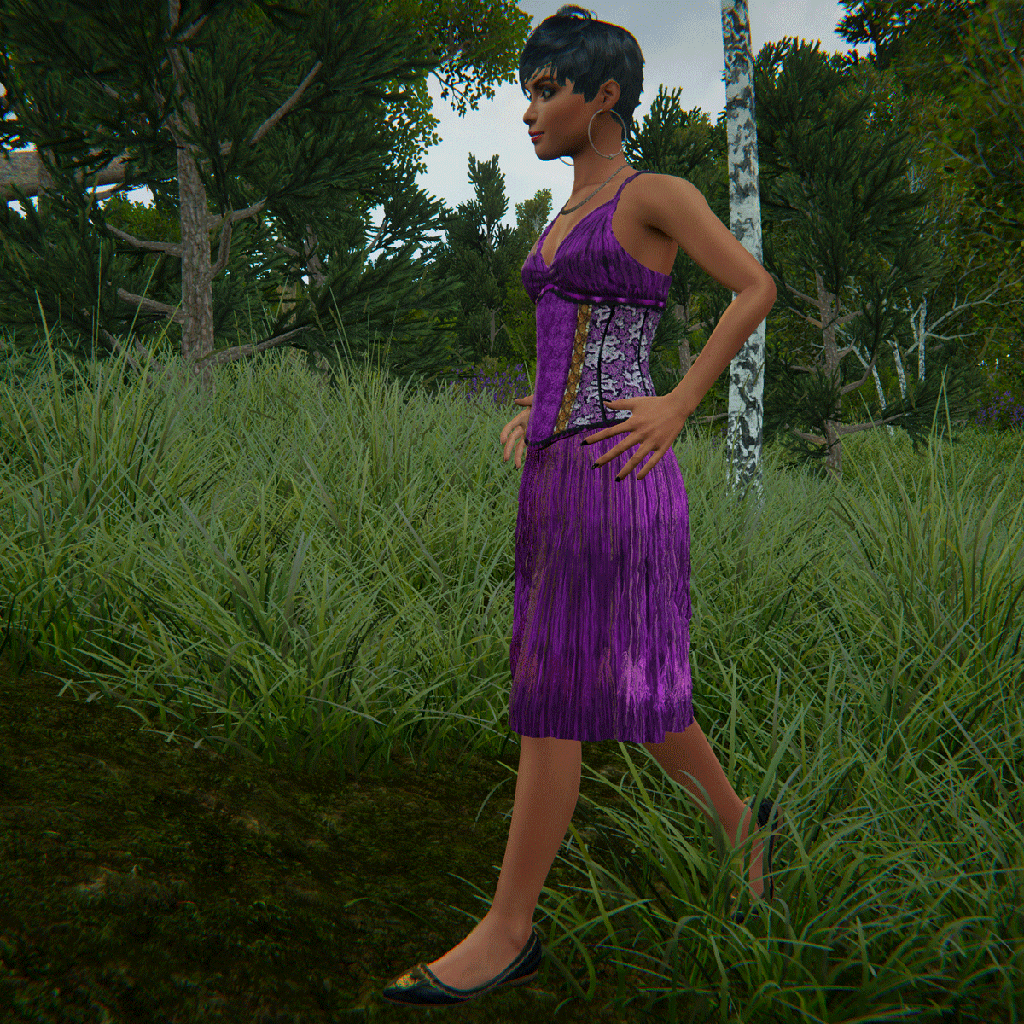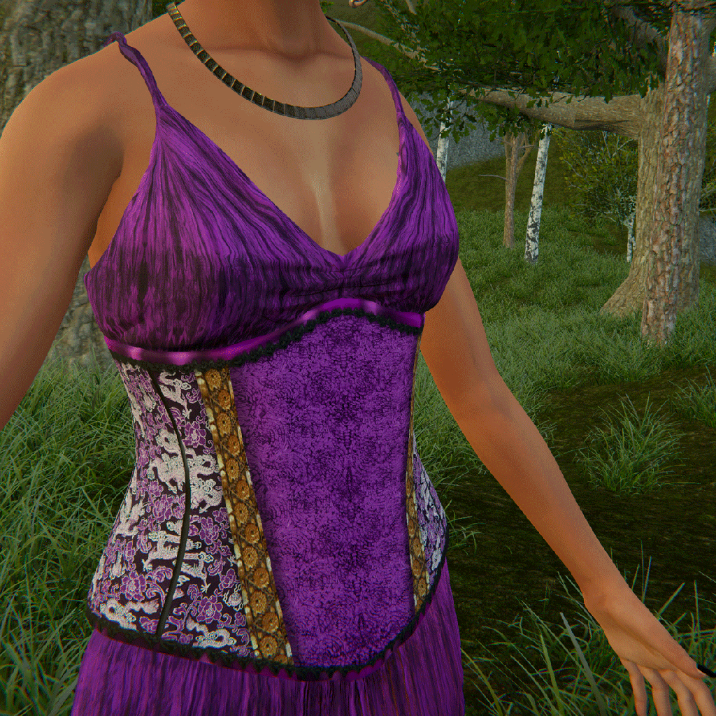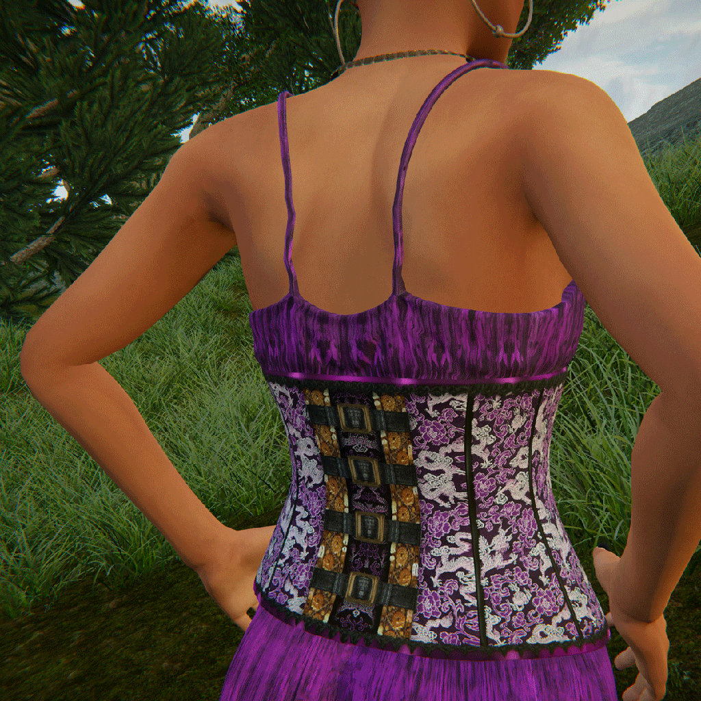 A beautiful outfit that includes 4 pieces: top, mini skirt, long skirt and panties. The corset is inset with dragon patterned silk brocade. It can be worn with either the mini or long flexi skirt, and includes a pair of panties to be worn underneath. Fits female avatars. Features high quality model and cloth physics (where available).