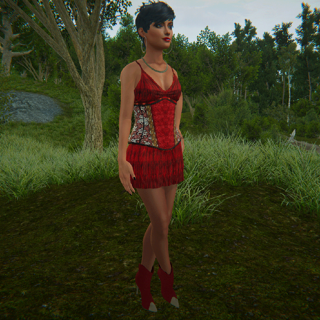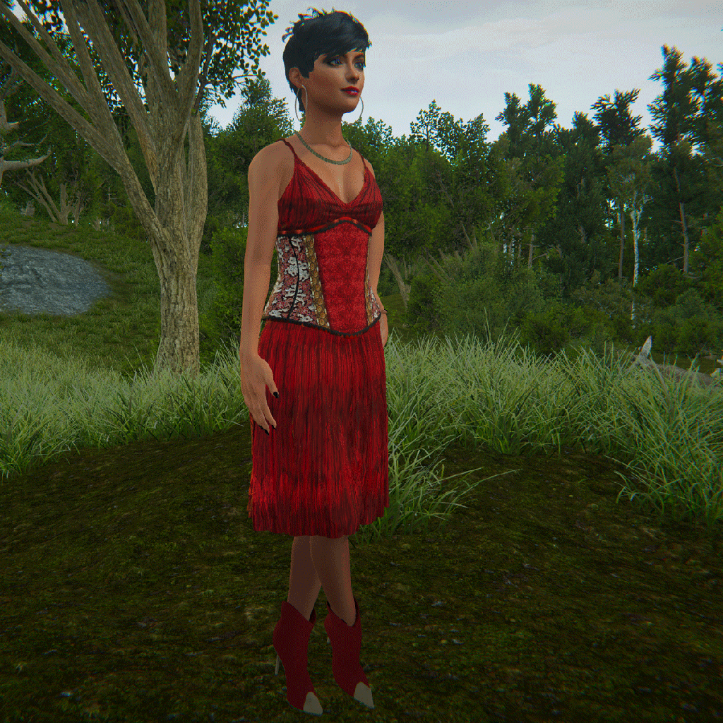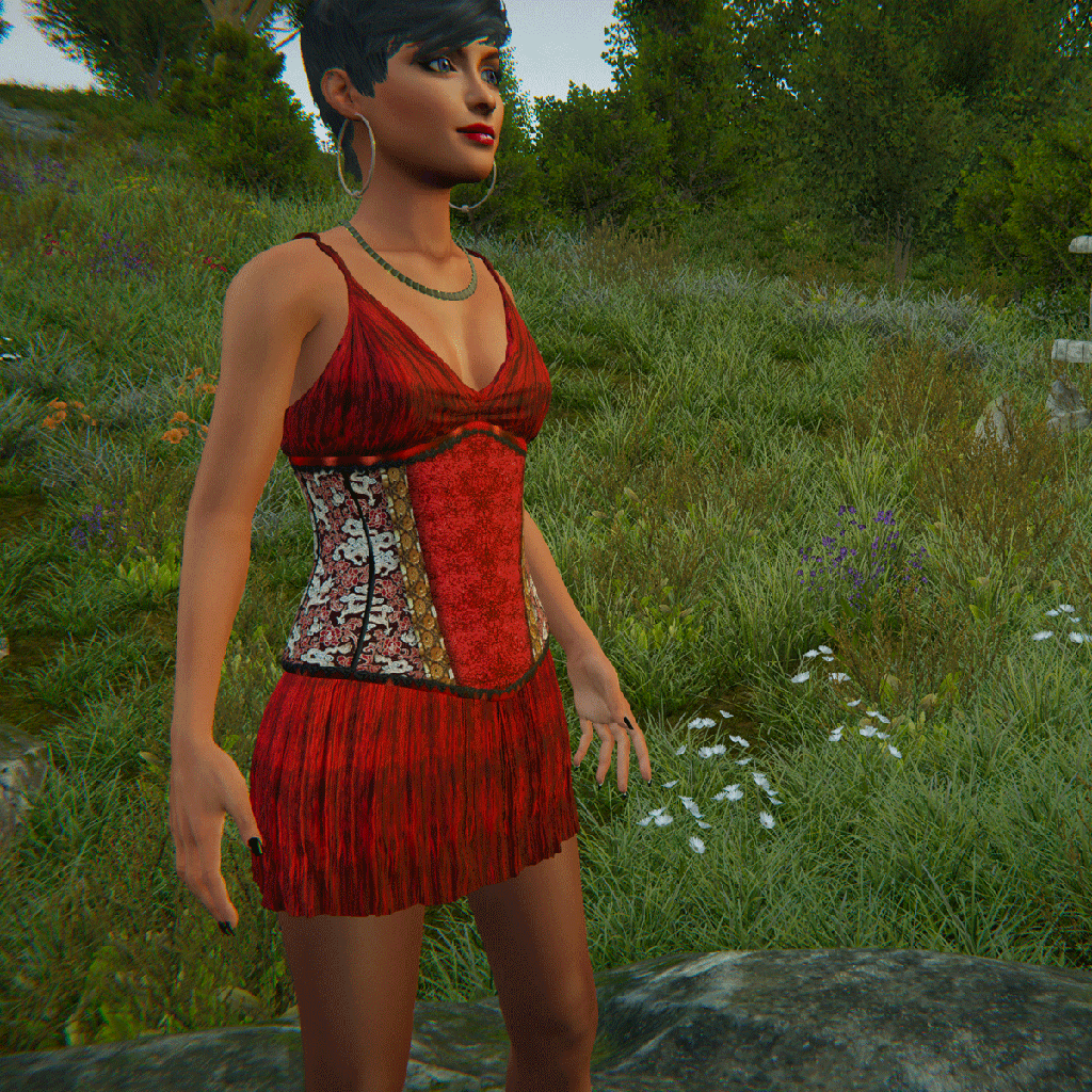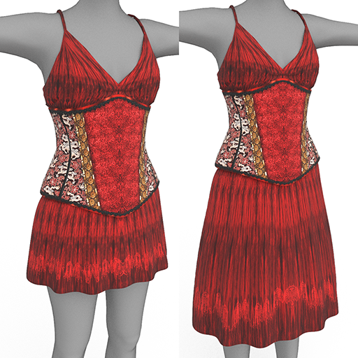 A beautiful outfit that includes 4 pieces: top, mini skirt, long skirt and panties. The corset is inset with dragon patterned silk brocade. It can be worn with either the mini or long flexi skirt, and includes a pair of panties to be worn underneath. Fits female avatars. Features high quality model and cloth physics (where available).