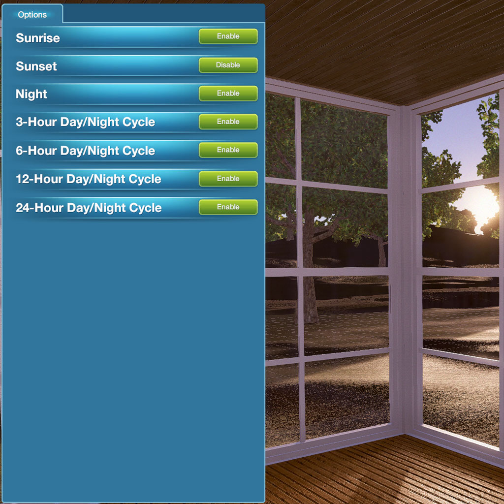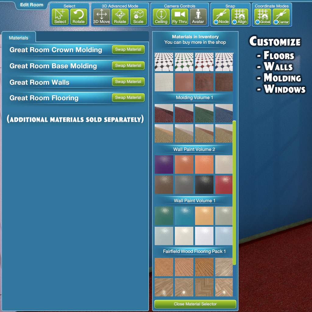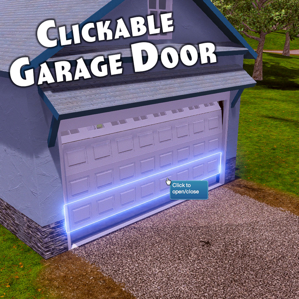 A 2 story, 3 bedroom home with garage in a sprawling rural countryside. Features swappable materials, clickable doors, adjustable lights, plus selectable day and night lighting.
