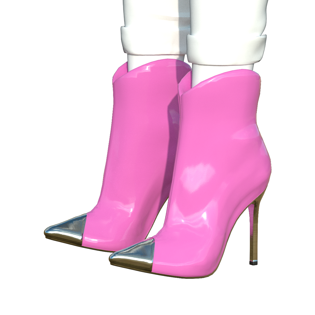 Ultra-sexy patent leather ankle boot rises to incredible heights on a spiked metal stiletto heel, with a matching metal toe cap. The boot leather contrasts the metal details in a fabulous style. These boots will turn heads for sure! Bundle includes 6 pairs of boots for female avatars. Features high quality model and advanced materials.