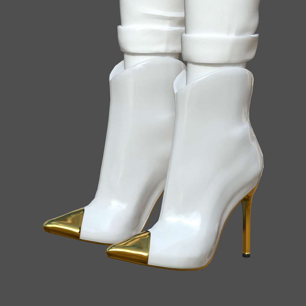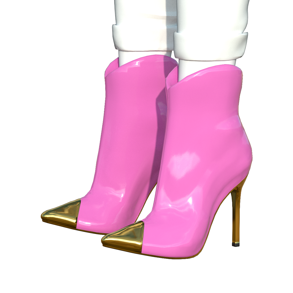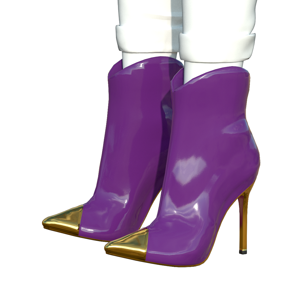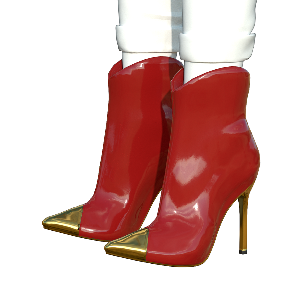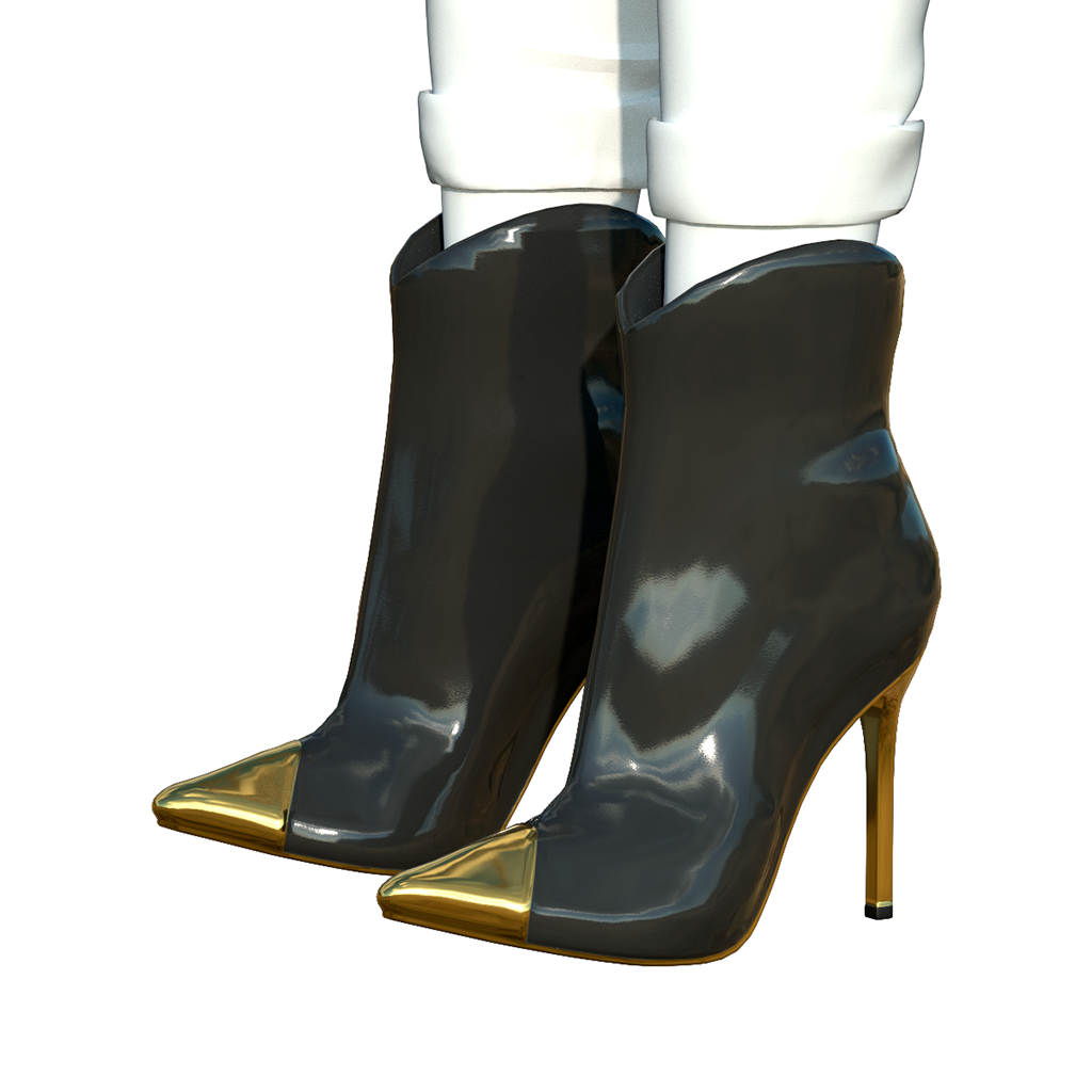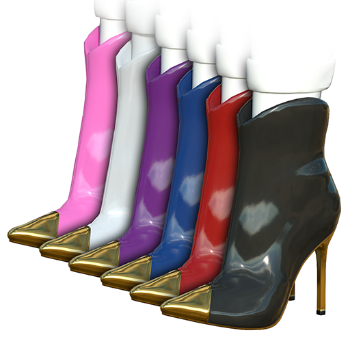 Ultra-sexy patent leather ankle boot rises to incredible heights on a spiked metal stiletto heel, with a matching metal toe cap. The boot leather contrasts the metal details in a fabulous style. These boots will turn heads for sure! Bundle includes 6 pairs of boots for female avatars. Features high quality model and advanced materials.