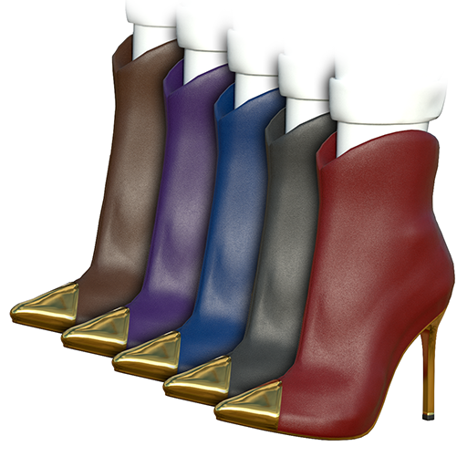 Ultra-sexy leather ankle boot rises to incredible heights on a spiked metal stiletto heel, with a matching metal toe cap. The boot leather contrasts the metal details in a fabulous style. These boots will turn heads for sure! Bundle includes 5 pairs of boots for female avatars. Features high quality model and advanced materials.
