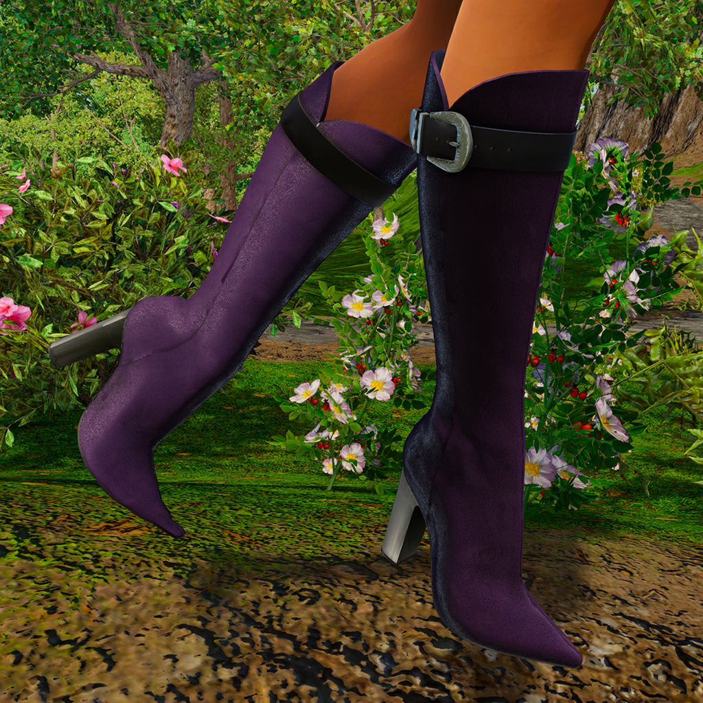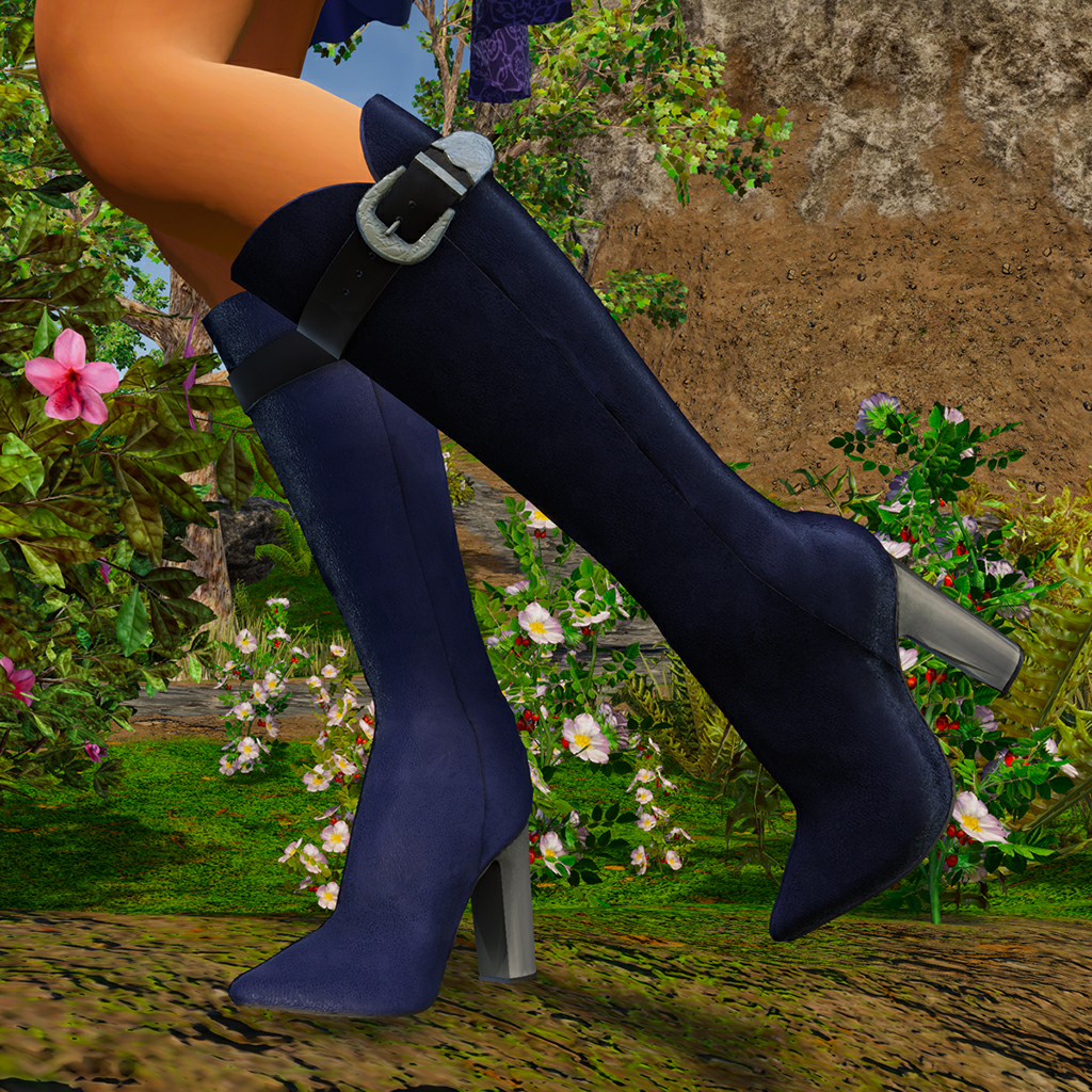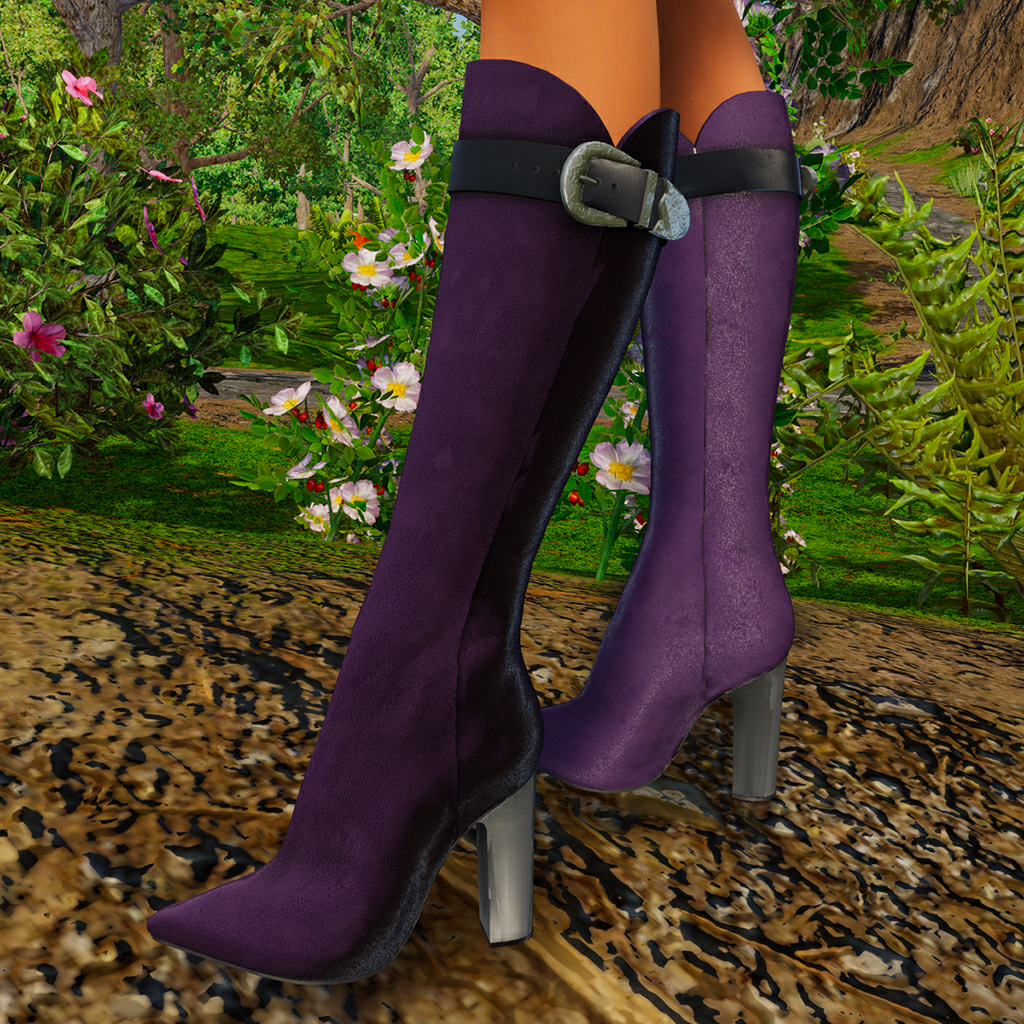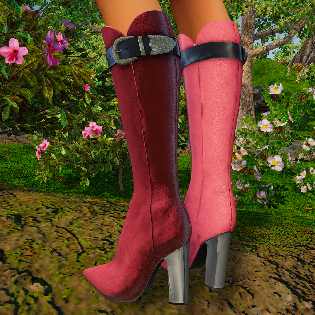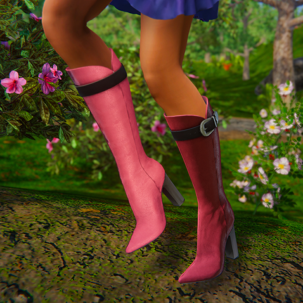 Knee-length boot with towering chunky heel, and spiny toes. A fabulous textured leather with sexy curved cuff has a contrasting strap at the top with a pressed metal clasp. Features high quality model and advanced materials. Bundle includes boots in 6 colors for female avatars.