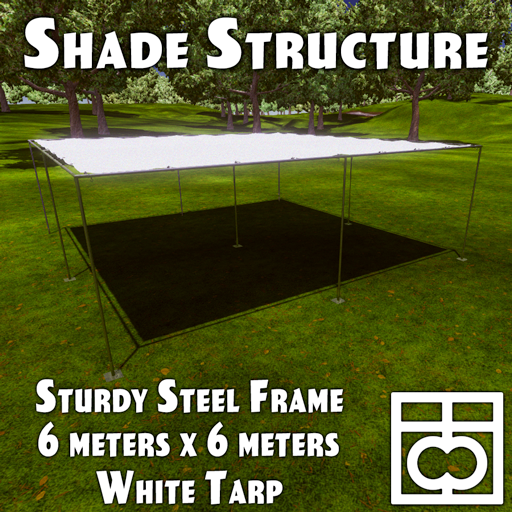 Sturdy shade structure with EMT conduit frame. 6 meter x 6 meter white tarp roof is attached by ball bungee connectors. Placed as furniture using Room Editor. Resizable. Features high quality model, advanced materials cloth physics (where available).