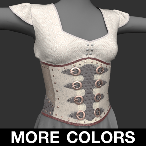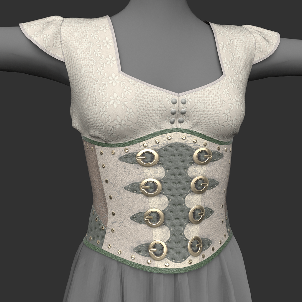 A sweet embroidered lace top with a square neckline and soft cap sleeves. It features a waist-cincher corset of pieced leather studded with rivets, with rows of buckles down the front and laced up the back. Features high quality model, advanced materials with and cloth physics (where available).