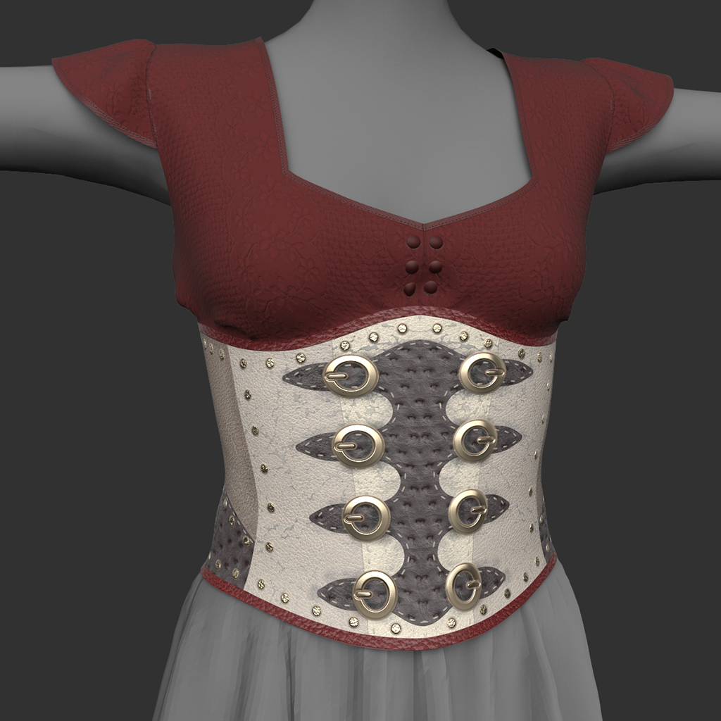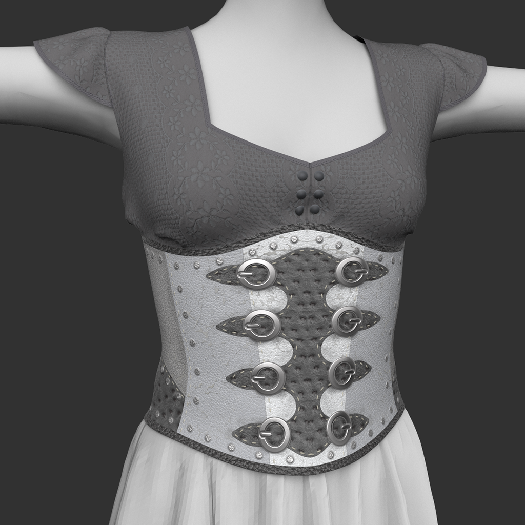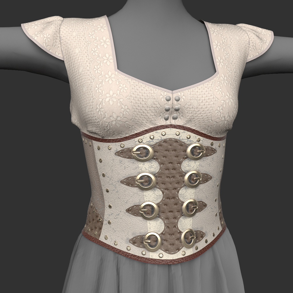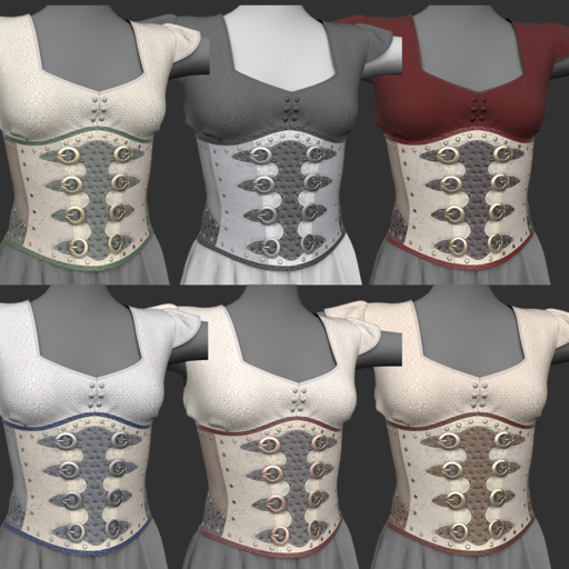 A sweet embroidered lace top with a square neckline and soft cap sleeves. It features a waist-cincher corset of pieced leather studded with rivets, with rows of buckles down the front and laced up the back. Features high quality model, advanced materials and cloth physics (where available). Bundle includes corset top in 6 colors for female avatars