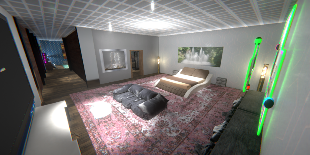 This is a Lodge With a huge Living area, 2 Bedrooms a Bathroom kitchen and dining areas custom smart lighting in each room