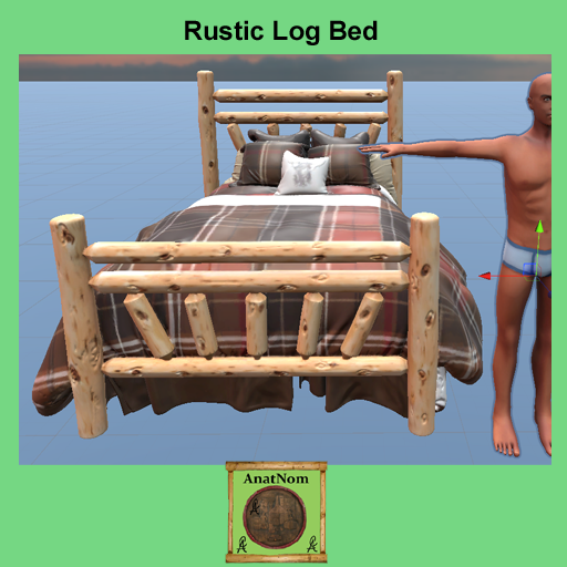 Rustic Log Bed Frame with linen on it & a seat posistion lying down